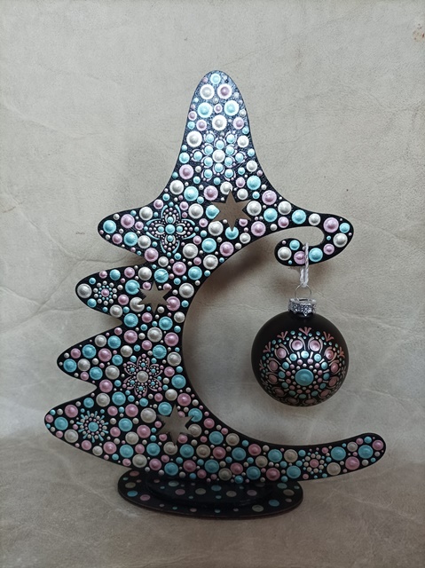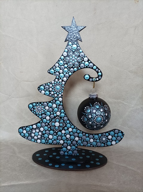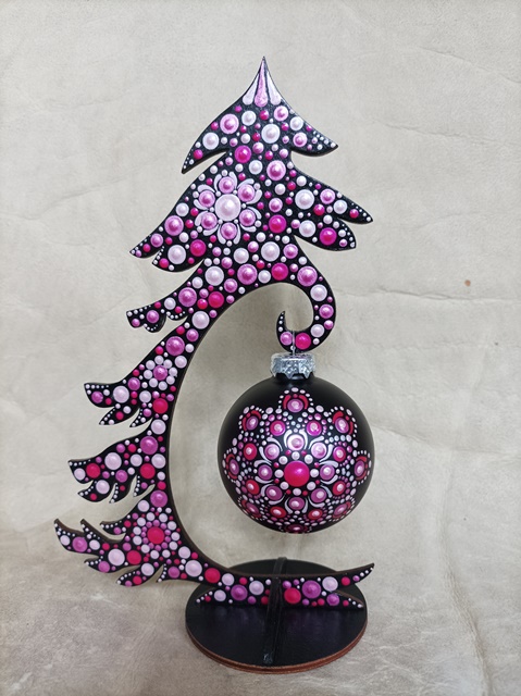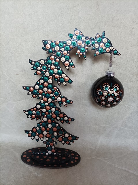 21 cm magas, 6 cm-es üveggömb dísszel, fa alap