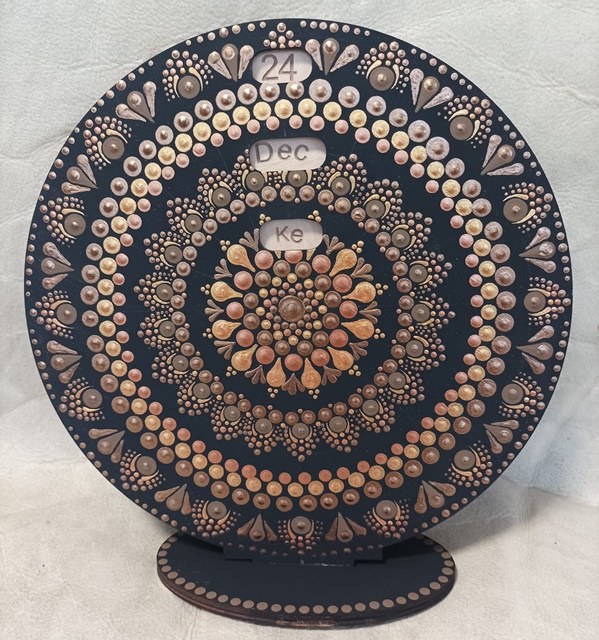 Barna/arany mandala öröknaptár, 20 cm-es, talpas, fából készült